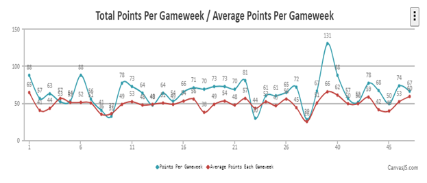 My aim at the beginning of the season was hitting a 60 average GW score, minimizing hits, and utilizing the first WC as late as possible. Looking back, I can safely say I achieved all 3 of my main pre-season objectives. As you can see that I had only 3 GWs where I scored below average and hence the overall positive outcome.