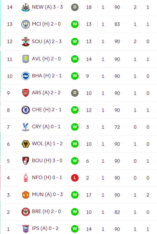 - 26 points vs Everton in GW33- 4 goals