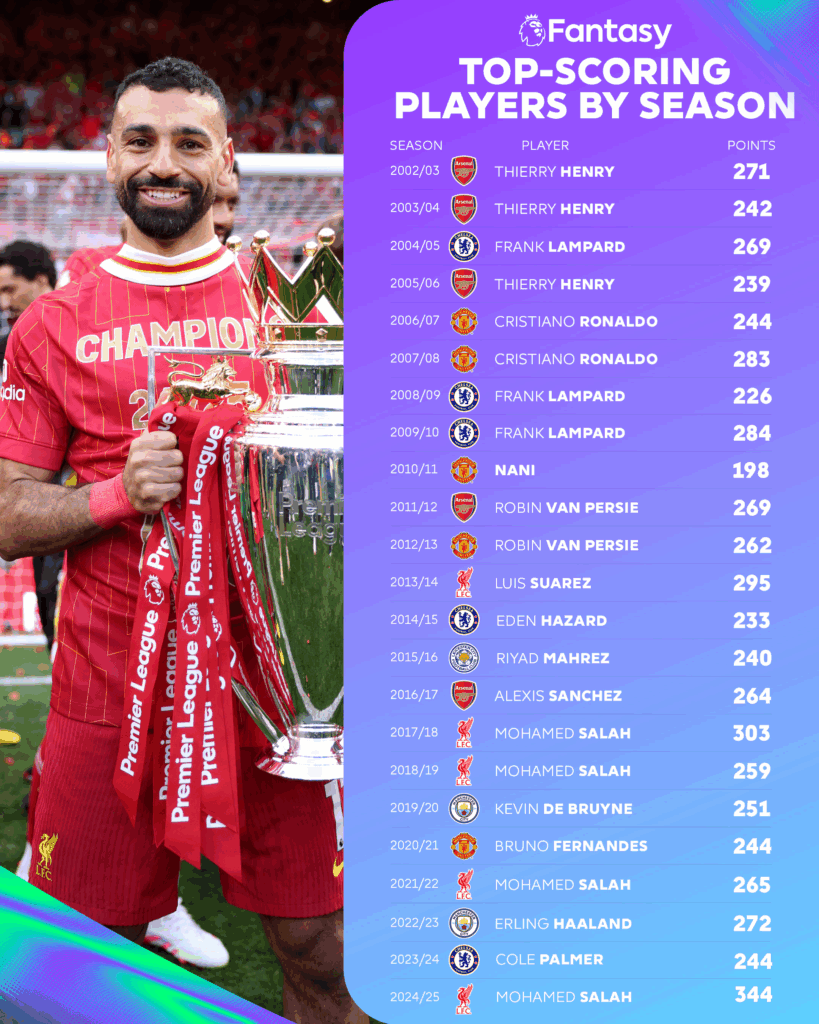 Full list of Highest Scoring FPL Players every season since FPL began in 2002/03: