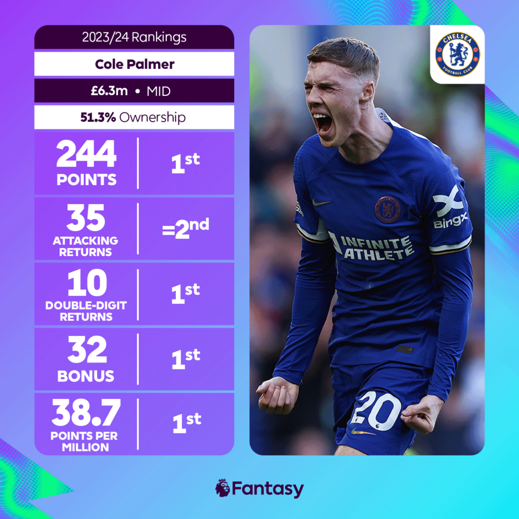How about a Midfielder starting at just 5.0 million finishing as the Highest scoring player in the game. After moving from Manchester City, Palmer was not even a starter and he had to wait till GW7 for his first start. But from there it was no looking back. What followed was unbelievable. From there till the end of the season, Palmer got 35 FPL Returns(22 goals, 13 assists) from 30 matches getting 240 points averaging 8 points/game.