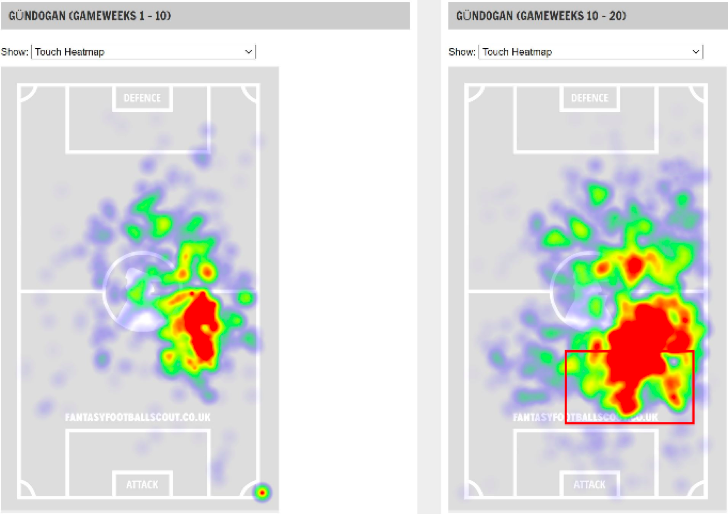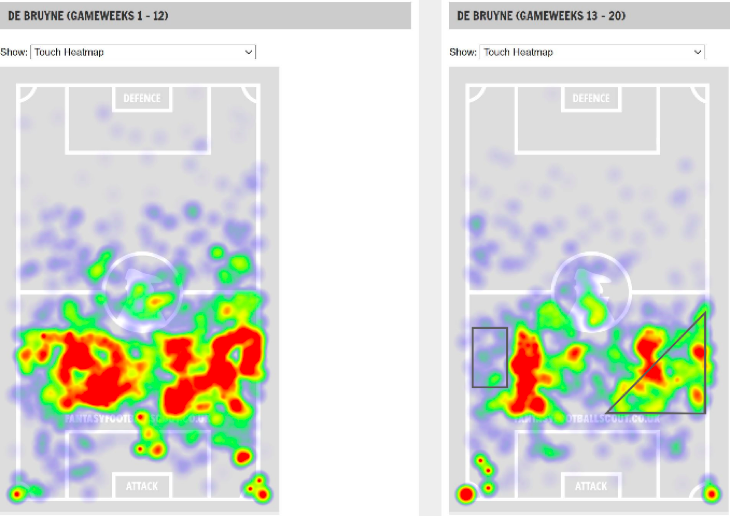 To unlock the secret to Cancelo’s success, we must travel back to FPL GW13 when Ilkay Gundogan netted his first goal of the season. It was, in fact, our boy Cancelo who assisted the assist when he played Sterling into the box before Sterling found Gundogan, but it’s KDBs positioning as of this match, that is of immediate interest. The heat maps show us that KDBs positioning has been shifting to the inside channel on the right side since Gundogan has been involved more in the attack.