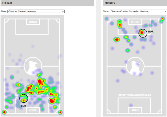 Burnley is perhaps the easiest fixture, but Pope is obviously a difference maker. I explained earlier why Pope was a good selection, which means the bright spot for FUL players must be taken with tempered expectations. If there is a bright spot, I believe it is BDR. The two heat maps show FUL chances created on the left and BUR chances conceded on the right. The circles indicate the area of the field where BDR has been getting his chances over the last 4 GWs.