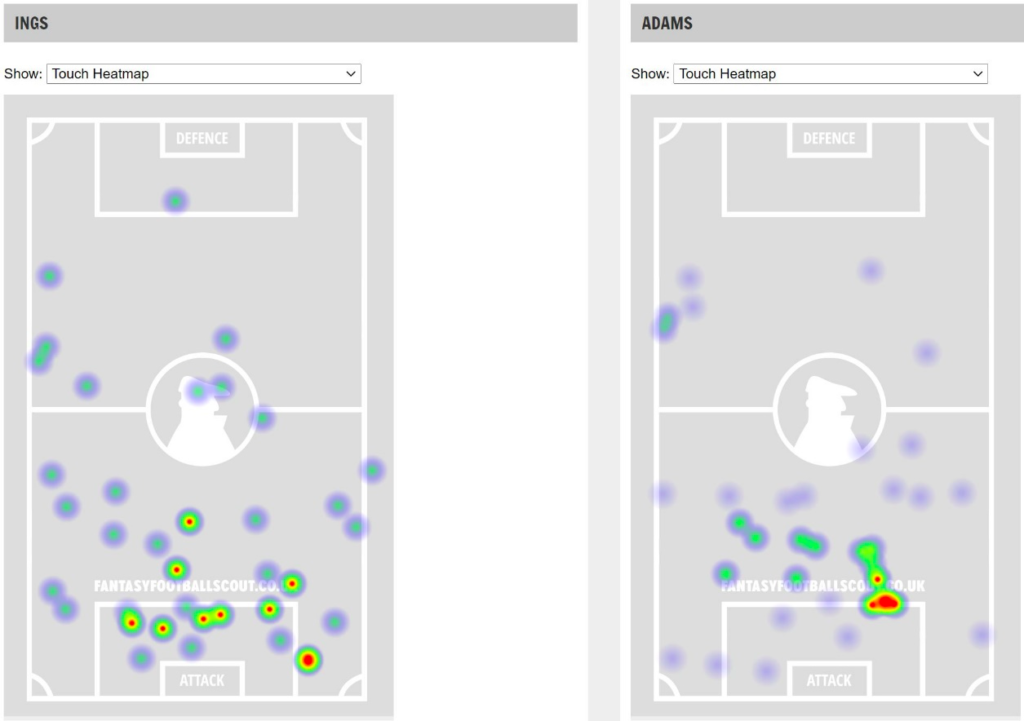 Comparing Adams to Ings confirms Ings is much more involved in everything SOU do. The touches heat map illustrates this idea nicely.