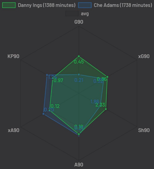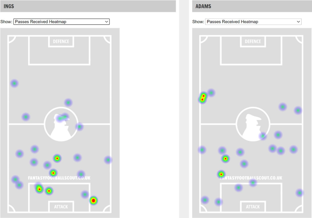 The passes received heat map is more in line with what I experienced watching the match. Che is involved more in linking play and creating some chances. His radar map from @understat confirms this by showing Adams w/ more KP/90 and slightly higher xA/90, while Ings has more goal threat.