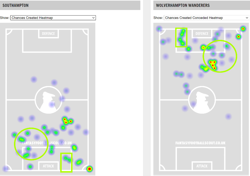I have highlighted 2 potential areas of the field where SOU could have some success based on recent trends from a chances created and chances conceded perspective. The circle represents the area of the field where Ings can do some damage (see Ings’ passes received heat map). The rectangle is me looking to Minamino to build on his performances and get in behind Semedo.