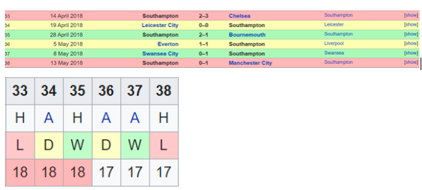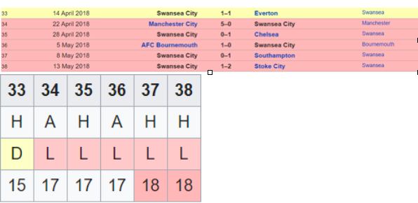 Swansea did the reverse of Southampton after having fought back from bottom to 13th place by GW 29 with consecutive wins over Liverpool & Arsenal at one point. However, it seemed an early rise as when things looked better for them and they seemed set for another season in PL, they just could not cope up anymore with the pressure. A deeper look at the last 4 matches shows you pretty close matches and a fight that just did not result in any points for them. Overall, though they thoroughly disappointed and ended getting relegated.