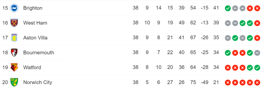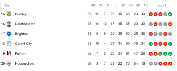 Now, let us look at this season and how the bottom 5 looks like today ( before Lei vs West Brom in GW 32):-