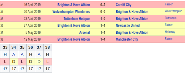 Having started the season brightly being around top 10 for most part, Brighton imploded in the second half of the season littered with losses and draws with only 3 wins of the last 18 matches. Their season ended with 3Ls & 3 Ds. The only saving grace being the poor performances of those down below. Brighton did however have a tight loss to Spurs, draws with Arsenal and Wolves which will show some glimpses of our principle. However, overall assessment is well known.