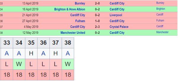 In the aftermath of a transfer that never went through of Late Emiliano Sala, Cardiff side tried to battle to save what was their 2nd season in PL history. Cardiff entered GW 33 having been in 18th position for 5 straight weeks and despite best efforts ended with 3Ls & 2 Ws.