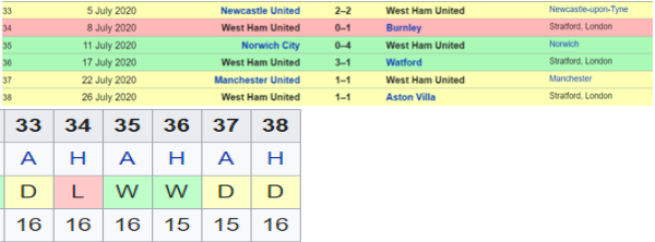 Having stopped a run of 3 losses with an exhilarating 3-2 win over Chelsea in GW 32, West Ham started their form of this season with this run of 2Ws,3Ds & 1L. David Moyes side built on Antonio playing as a forward and used their pieces well as a 4-0 thrashing of Norwich ( Remember those Antonio points or did you miss out !!) They defeated Watford as well ensuring they remain safe for the next season while the season ended with hard fought draws against Man United & fellow strugglers, Aston Villa. This was a glimpse of the UCL contenders that we have seen this season for sure.