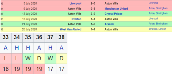 Having spent last 5 weeks in bottom 3 & winless from the last 8 GWs, Aston Villa perhaps were set for relegation as they started this stretch with 2 expected losses against Liverpool ( late second half goals sinking them) & Man United. However, a solid 2-0 win against Crystal Palace gave them some hope while they remained rooted at 19th with 3 weeks to go.