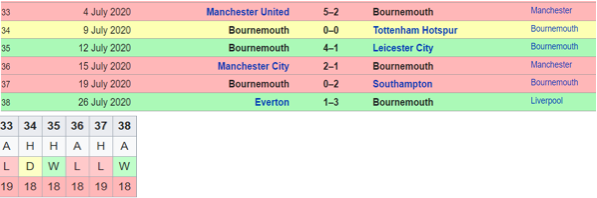 Bournemouth FC came into GW 33 with 7 match winless streak (6 Ls & 1D) looking very similar to Aston Villa and very surely at the relegation corridor.To make things worse, they faced a rejuvenated Man United with Bruno magic working heavily in a 5-2 defeat. Next up was a tightly fought 0-0 draw against spurs with both sides lamenting referee decisions as Bournemouth almost won it late. As Bournemouth fought for the last time to save themselves, they came up with a surprise 4-1 win against 10 man Leicester giving some glimpses of comeback. Next up were revitalized Man city- and in a tighlty fought match, City supremacy put them through 2-1. The battle was lost in a 2-0 loss to Southampton at home with the second goal coming deep into extra time. Bournemouth went down in style with a 3-1 win against Everton and would definitely have got away had they woken up slightly early. Reaction factor definitely there as Leicester, Everton and Spurs found out.