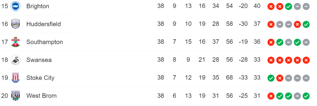 2017-18 had one of the toughest relegation battles with the bottom 5 pretty much mired in the battle till the very end. A quick look at the PL table will tell you how the teams ended this season with some variance in their results towards the end. We will look at them in some detail now below.