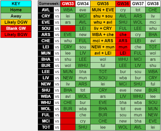 Now, as always, it’s highly recommended to wait until as close as possible to the deadline, before making any transfers. This week that rule has even more importance as we may find out details about the possibility of DGW35. Fixture planning guru, Ben Crellin, tweeted on Apr 21st that he’s about 70% sure this could be the schedule for DGW35.