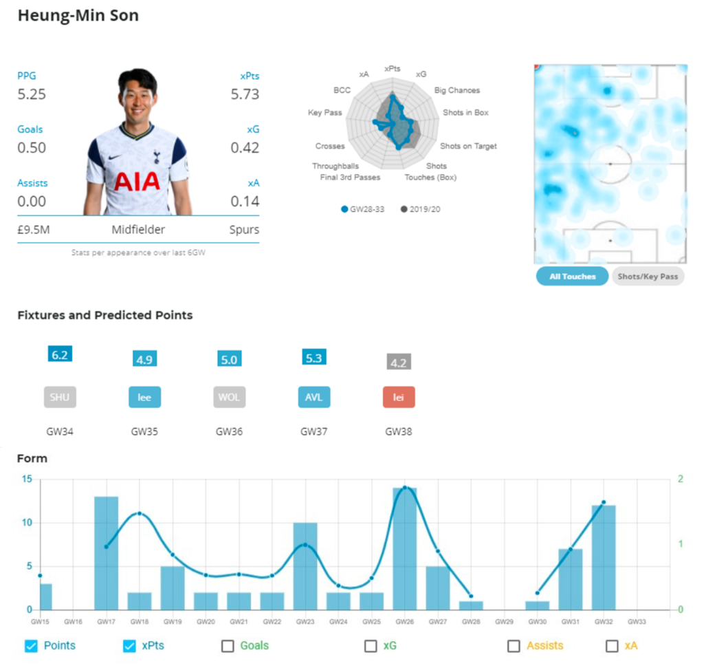 The Predicted Points Tool is projecting 6.2 points for Son in GW34 with only Kane predicted to score more, and 25.6 points across his remaining fixtures.