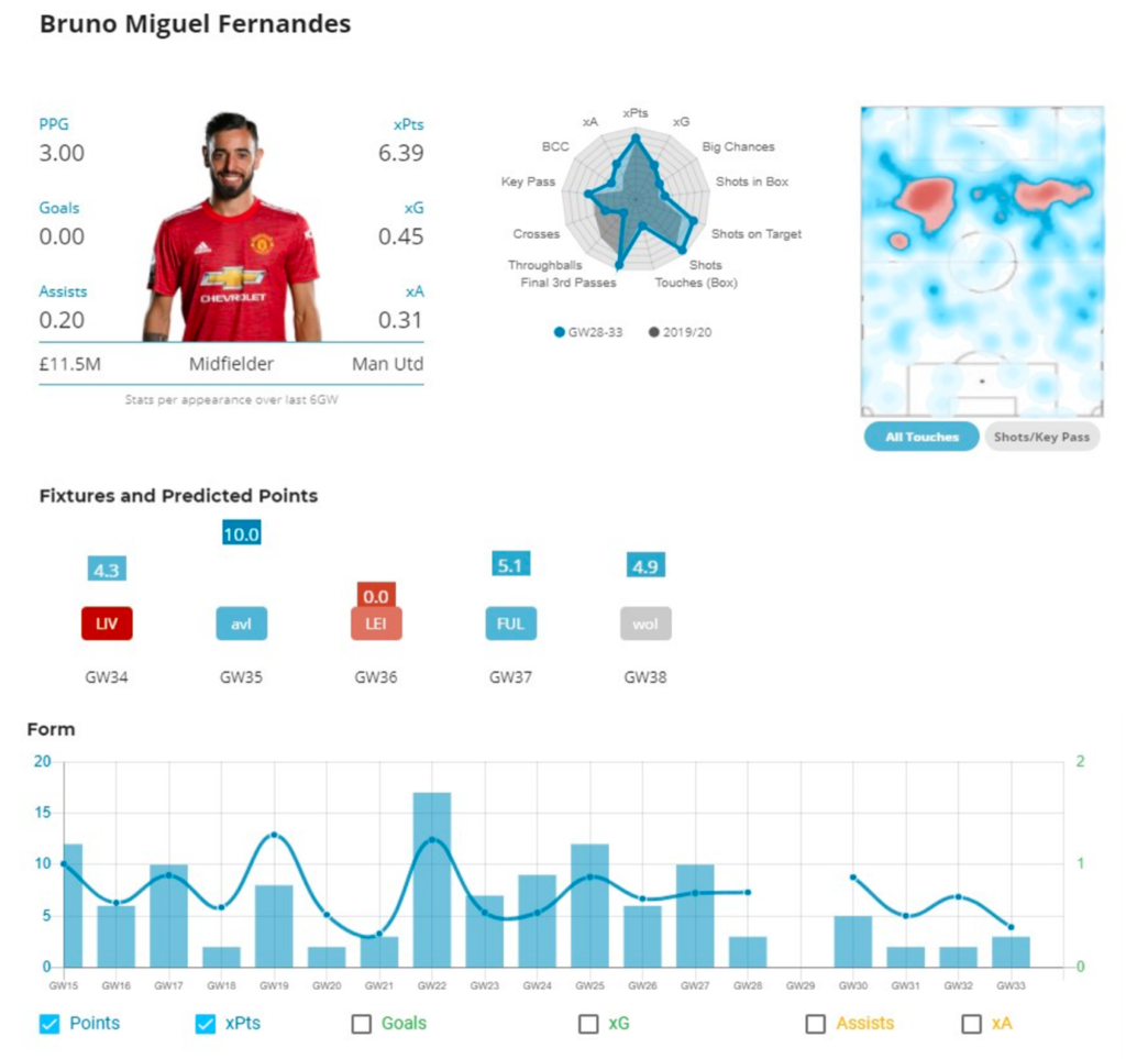 The Predicted Points Tool is projecting 4.3 points for Fernandes in GW34 vs Liverpool but with the prospect of a double in GW35, he’s projected to score 10points here, before a possible BGW in 36. These are all things that need to be taken into consideration.