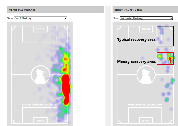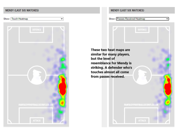 Mendy – Mendy’s positioning and role on the field is exciting, and I do believe Pep will prioritize getting his defense back on track, but to do that, he will probably use Zinchenko on the left side. Rather than deal with this headache, I have elected for the more affordable Stones. He is also quite likely to start after serving his 3-match ban. Stones in for security and price. The heatmaps show us how advanced Mendy plays. He even doesn’t recover very deep. It also shows that almost all his touches come from passes received. Touches and passes received is similar for most players, but it is typically not identical like this for defenders. Mendy is an attacking player in this side. I’m still keeping my Stones.