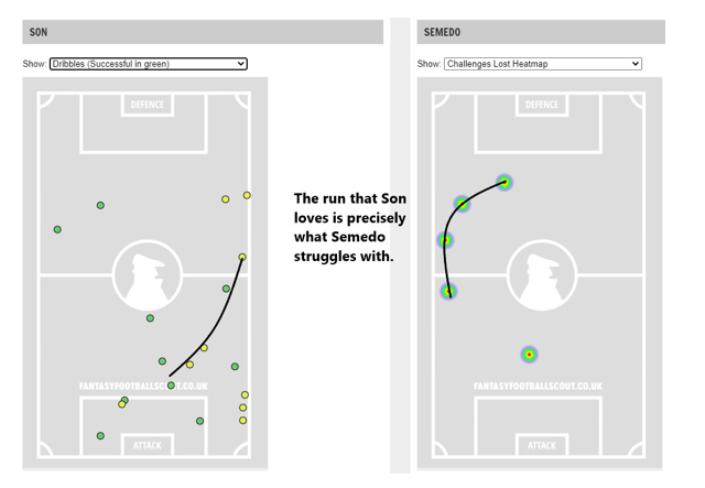 Son – One of my favorite players this week. As most turn their eyes to Kane as “essential,” I don’t like the fact that WOL have conceded the 6th fewest BC in the last 6 matches (10), and have only conceded 11 chances from the center of the field. Son’s matchup against Semedo, on the other hand, seems quite tasty. WOL have conceded 21 chances from their right in the last 6 and Kane only has 1 more SIB than Son in that time.