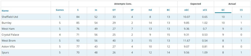 In their first match, Palace are away to Sheffield United. Sheffield United are already relegated, after losing to Wolves in GW32. In the 4 weeks leading up to and including that match (GW29-32), their defensive record wasn’t the worst.