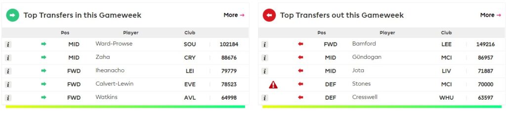 DGW players dominate the top 5 transfers in this week. 102k managers have bought James Ward-Prowse – the most transferred in player so far. 88k managers have bought Wilf Zaha, while 79k have bought Iheanacho – the most transferred in FWD so far.