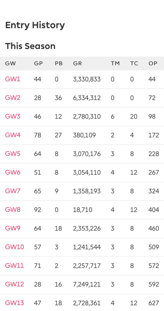 I started FPL because a bunch of friends wanted me to play, I wasn’t keen but agreed anyway. They wanted me in the league so would be last and they wouldn’t Basically. I treated the first 13 weeks of playing very casually, missing deadlines, taking huge hits, and just generally didn’t understand how to play the game.
