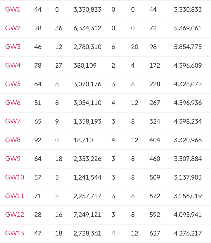 You’ll see between game week 3 and 13 I took 27 hits calculating at 108 points in hits. Shocked? It wasn’t until I hit realized how to play the game properly and entered the FPL community and realized how shocking and damaging this would be to my rank. But when I did the evidence was clear.