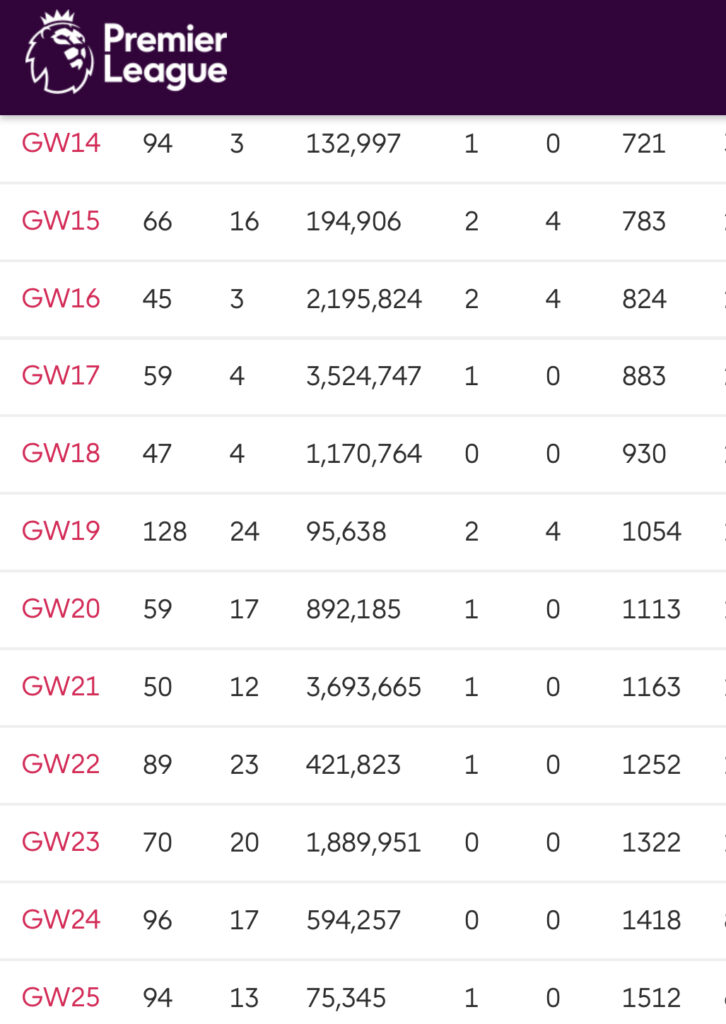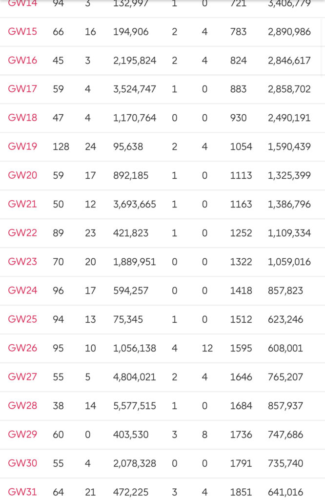 You’ll now see above that from the time I started taking the game seriously around game week 14 -25 and actually, within 12 weeks I had only taken 12 points in hits so just 4 points hits. That’s a 96 point difference from playing as a casual to playing seriously, a huge gap.