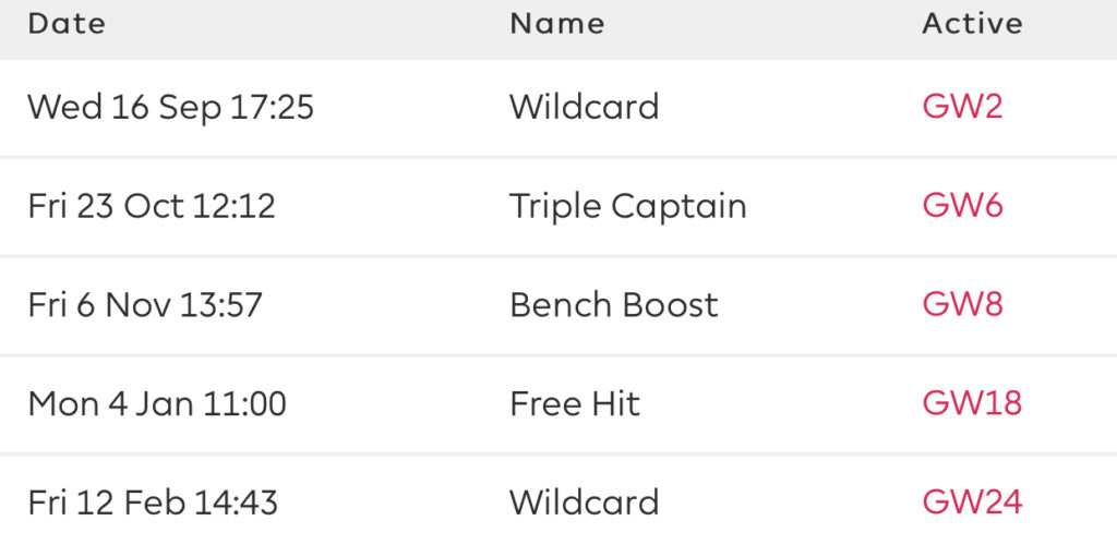 Another vital piece to the success of a season or rank I have learnt this season but as you can see a lesson learnt too late. Wildcard being used in game week 2, triple captain in game week 6, and bench boost in game week 8. If only I knew at this point that double game weeks actually existed. This shows again a disregard to the game and lack of knowledge that could now be so useful for the game weeks gone by. You’ll see that after that when I did have that knowledge I used my other chips in very significant weeks and with gain in terms of rank on both occasions in both a blank week and then using the wildcard tactically prior to a double game week which saw me hit three 90-100 points in a row. This shows that with having the knowledge in terms of when to use the chips it could seriously impact your season.
