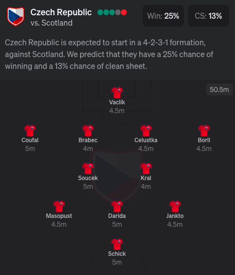 Czech Republic has qualified for their seventh consecutive European Championship, which is a remarkable achievement. They managed to finish second in their qualifying group, just behind England, and in fact, were the only side that beat the Three Lions in that group. Defensively, the team conceded 11 goals (6 of them against England) and only managed 2 clean sheets, which isn’t a good sign going into the tournament. Vladimir Coufal (5.0M) is definitely the standout option from their defense as he joins the team in spectacular form assisting 7 goals for club West Ham. Ondrej Celustka (4.5M) is supposed to be a nailed starter in center back and is a cheaper choice if the extra 0.5M couldn’t be raised for Coufal.