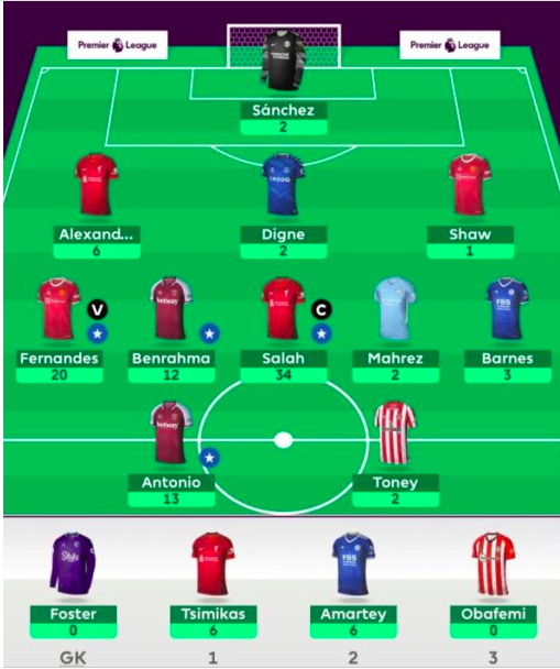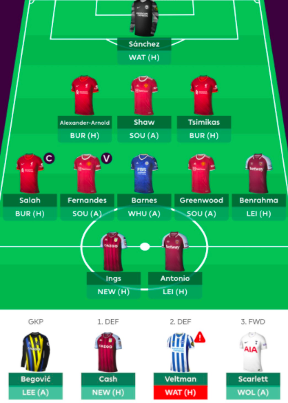 This is my Bus team so far and probably I am rolling the transfer this week. With the Armband is obviously the dilemma this week between Salah, Fernandes, and even Mahrez, however, I am relying upon Anfield and the Kop Roar. Just one late decision to be made on whether to play Barnes or Digne.