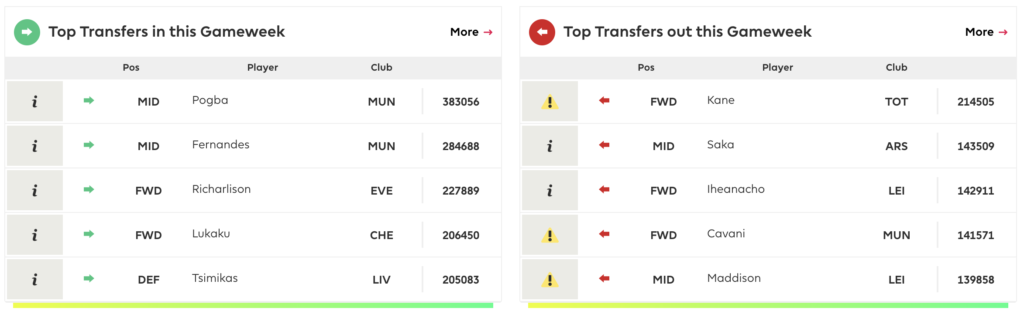 This week, we can see the transfer trends show people buying players from Man United, Everton, Chelsea and Liverpool. The top 5 transfers OUT come from Spurs, Arsenal, Leicester, and Man United.