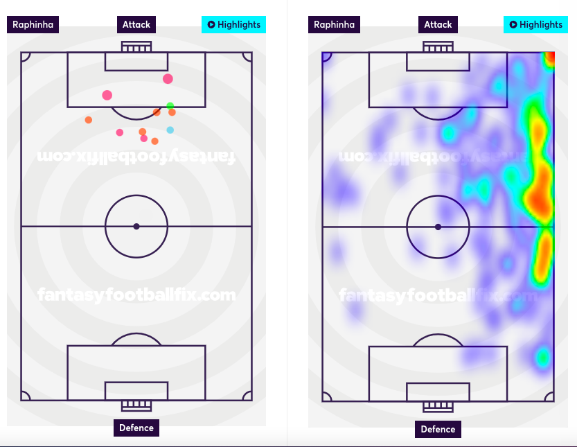 Raphinha has scored 1 goal so for, from 11 shots. He was able to register an xG of 0.93 and xA of 0.21, with 4 attempted assists. He also had 10 touches in the opposition box, which explains his advanced role, and the possibility to score more goals. Moreover, he is also on the Corners and sometimes takes freekicks, which increases his assist potential.