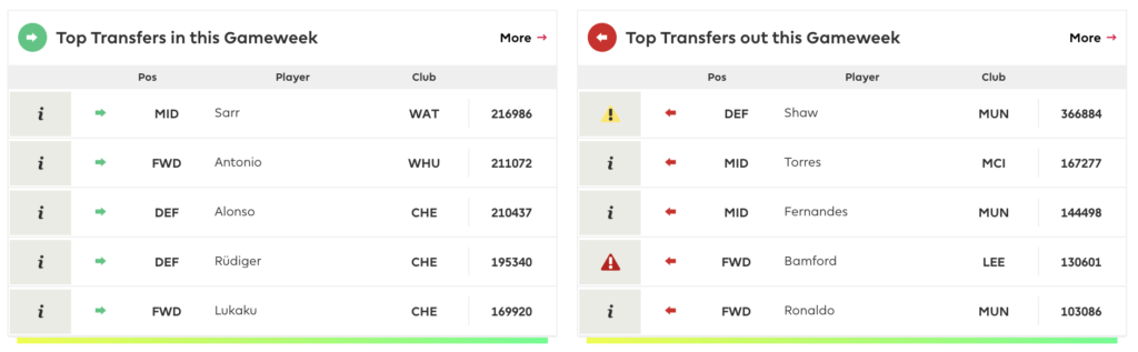 This week, we can see the transfer trends show people buying players from West Ham United, Watford, and Chelsea. The top 5 transfers OUT come from Man United, Man City, and Leeds United.