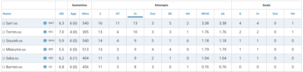Among all sub-7.0m midfielders, he currently leads for most shots in the box (13), big chances (5), and expected goal involvement (61%). He is also 2nd for touches in the box (35).