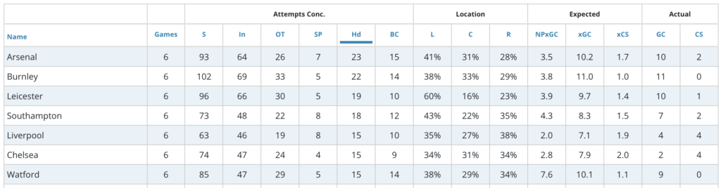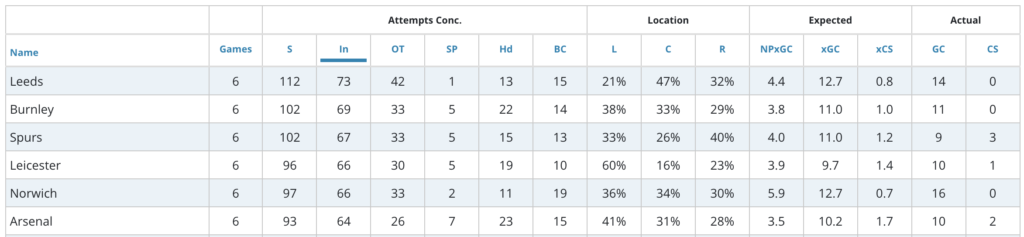 Watford play Leeds away in GW7. Leeds currently lead as the team having conceded the most shots in the box (73). They concede a lot of shots, joint with Newcastle for most goals conceded with 14 (2nd worst among all teams).