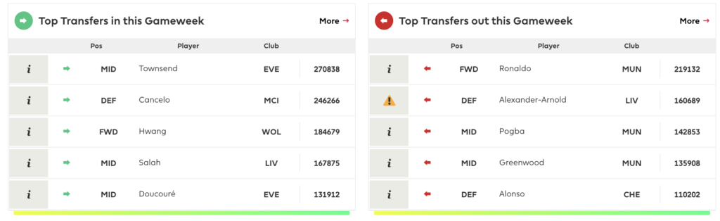 This week, we can see the transfer trends show people buying players from Everton, Man City, Wolves, and Liverpool. The top 5 transfers OUT come from Man United, Chelsea, and Liverpool.