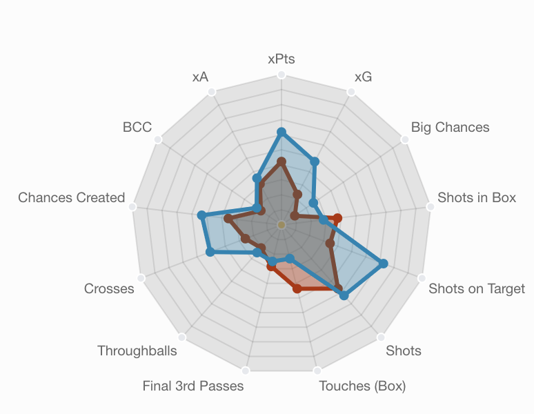 Statistically, he has 16 touches in the box and 10 shots (2 in the box, 8 out of the box). He also plays for Manchester City, one of the best defenses in the league, who have only conceded 3 goals and have kept 5 clean sheets, the most of all teams.