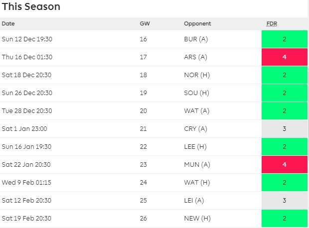 Manchester City’s fixtures during the festive period is extremely favorable. Three of their five fixtures have an FDR rating of 2. As a result of which it is wise to have 3 of their players in your teams.