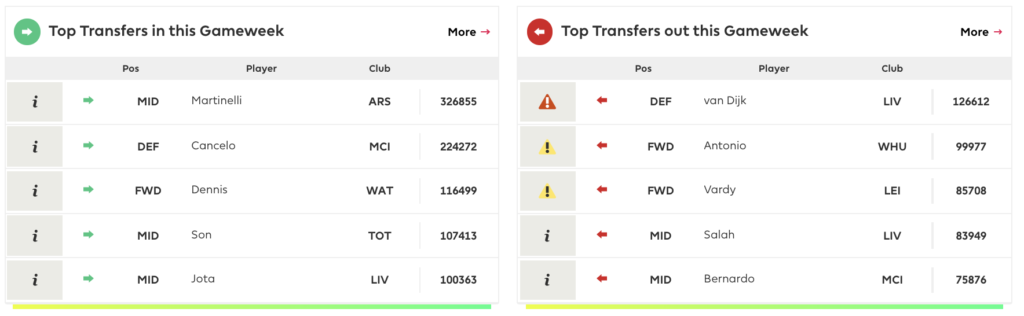 Van Dijk’s illness doubt sees him top the transfers out list, with 126k managers shipping him out. Antonio’s positive COVID test sees him 2nd on the list, with 99k managers looking elsewhere for forward options.