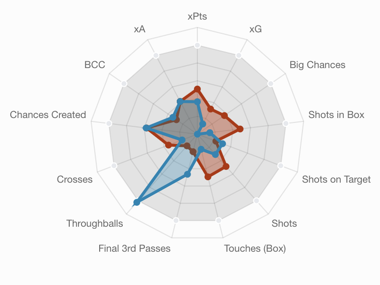 In terms of Man City’s defense, they are best for total shots conceded (114), shots in the box conceded (72), shots on target conceded (36), big chances conceded (12), goals conceded (9), and clean sheets (11). Safe to say City are one of the strongest, if not the strongest, defense in the league at the moment.