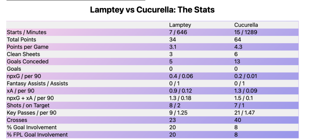 Lively Lamptey is back starting regularly and he’s one of the few defenders who is really good attacking-wise apart from the popular names. Against Chelsea too he was really good and caused trouble to the Chelsea backline. He has started the last four games on the bounce and he has his spot nailed most likely. From the below comparison with fellow full-back Cucucrella nothing warrants investing 0.5 more on him over Lamptey.