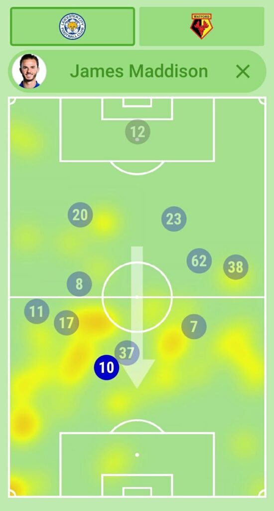 With the Vardy & Daka out injured and Iheanacho off to AFCON, Leicester played a 4-2-3-1 with Lookman up front with Maddison behind him. Looking at the average positions from SofaScore however, James Maddison (£6.9) looks like the more advanced player, making multiple runs past Lookman.