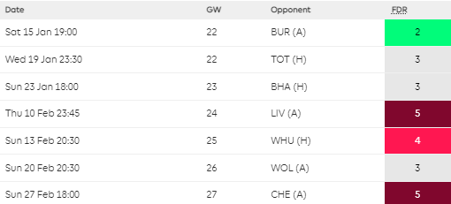 Leicester are 3rd on FFScout‘s Fixture Ticker (Attack) for GW22 & GW23, facing bur+TOT and BHA respectively.