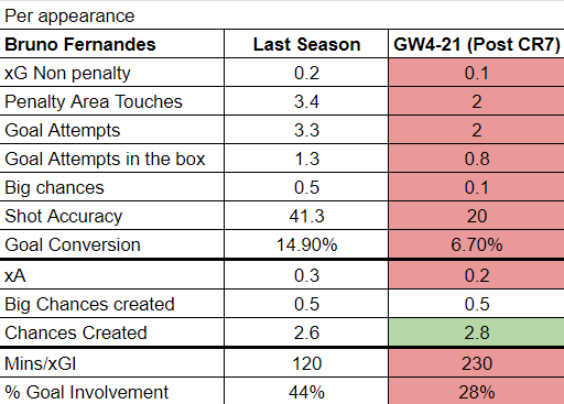 This should in theory improve Bruno’s underlying numbers over the next 3 games, although United have played with a 4-2-3-1 under Ole earlier in the season and Bruno did not shine (mins/xGI of 224 under the 4-2-3-1 with Ronaldo in the team). In my opinion, formation is not the issue for Bruno but rather the presence of Ronaldo in the team restricting Bruno’s freedom. In conclusion, against 3 decent defences in avl, bre and WHU, you will be hoping for returns rather than expecting.