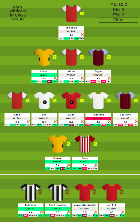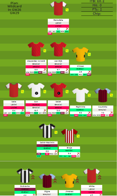 - 8/9 players confirmed for Blank Gameweek 30– Ramsdale, White, Saka, Coutinho, Digne, Raphinha, Jimenez, Kilman, Broja(If Southampton lose to West Ham in FA Cup). Can use the free transfers to bring in Leicester players (Maddison) for GW30 as they have a game in GW30 and 3 fixtures yet to be rescheduled.