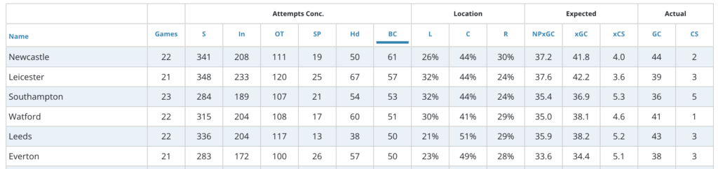 Newcastle concede 43% of their chances down the middle. Additionally, Newcastle have conceded the most big chances (61), and they have the 2nd worst expected goals conceded among all teams this season (41.8). This should be a good game for Villa to target.