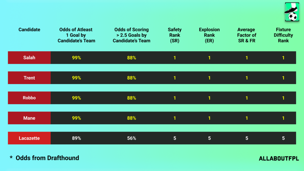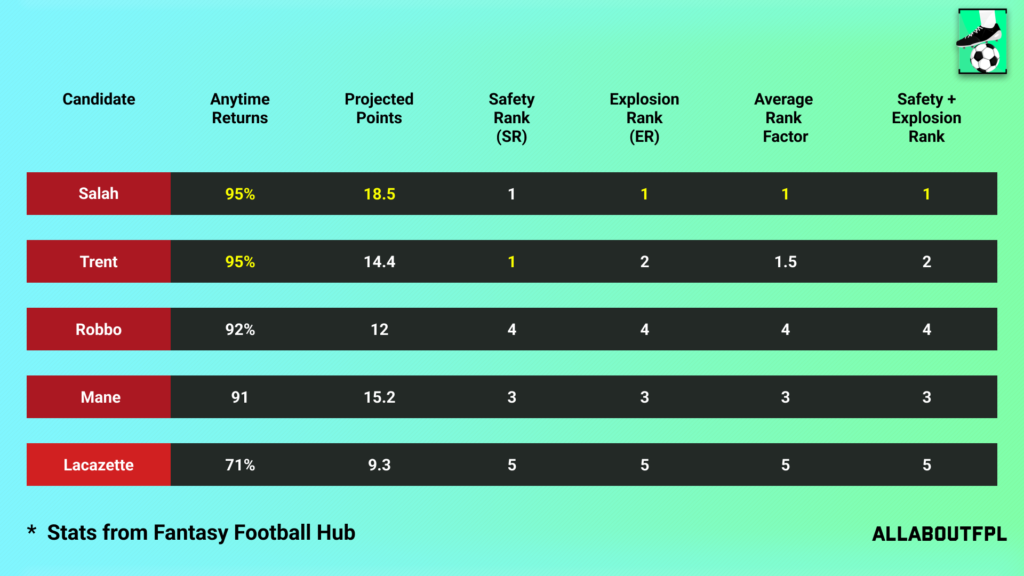 With the help of the Anytime Returns Tool, I have derived the Safety Rank, which helps in determining the Safest Captaincy Option of the week, while I have used the Projected Points Tool to determine the Explosion Rank, which helps in determining the Most Explosive Option of the week.