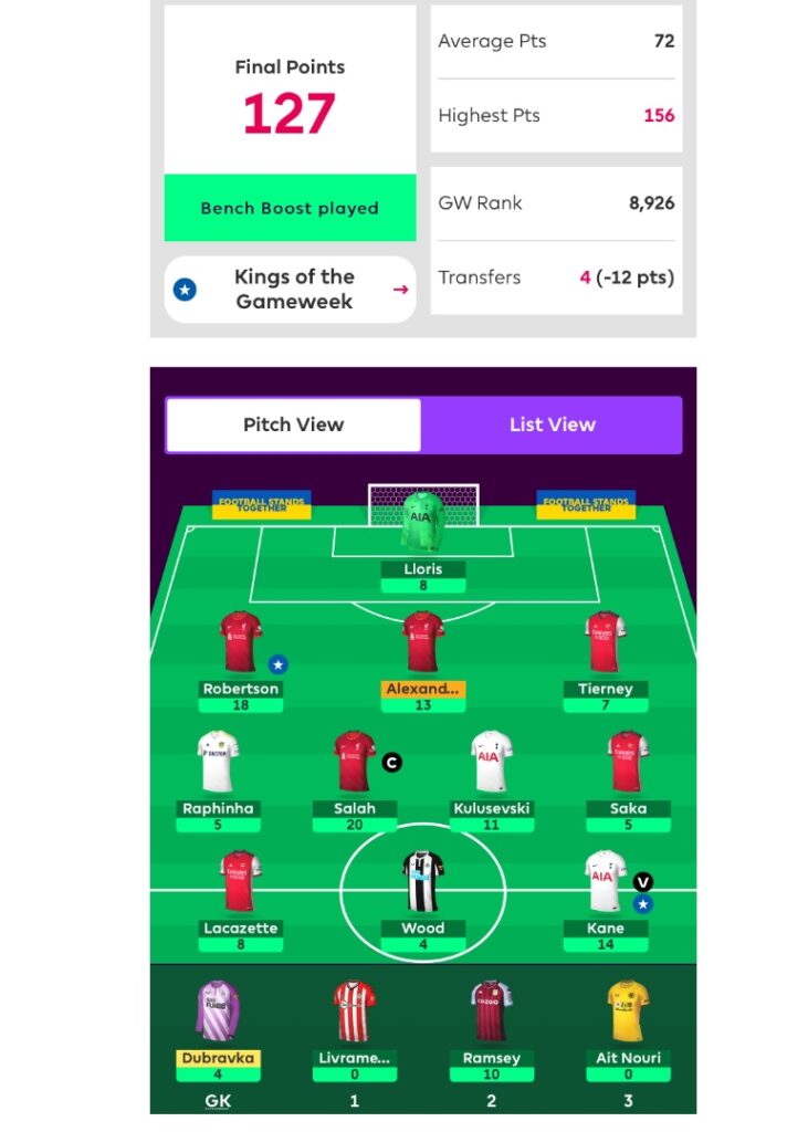 A few of his most successful picks include getting Ronaldo in for his 13-pointer against Newcastle on his debut, Tierney for his 12-pointer in GW 16, Watkins for his 12-pointer in GW 17, Bowen for his 21-pointer in DGW 21, Fernandes for his 23-pointer in DGW 22, Salah for his 28-point DGW 26 score and Robertson for his 18-pointer in DGW 29.