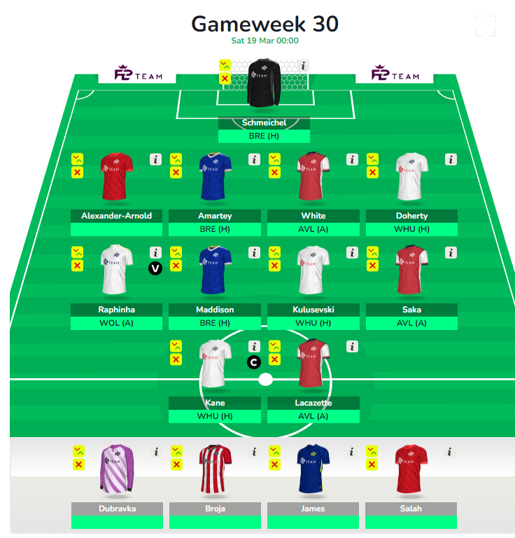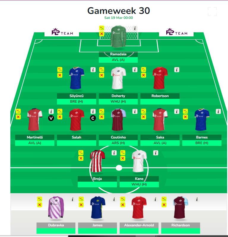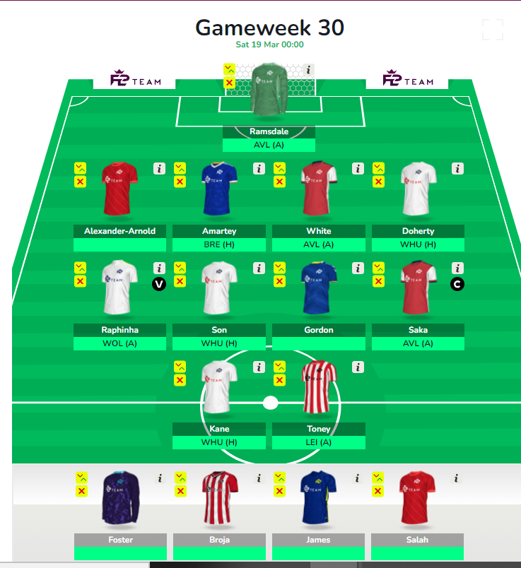 - Robertson to White, Gordon to Maddison/Bowen/Barnes(-4) as planned transfers for GW30. This means 10 players for GW30.