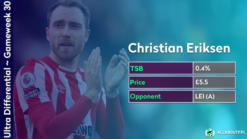 The Dane registered an assist against Burnley, last time out. It was a tremendous cross with his left foot. We all know Eriksen’s prowess from set pieces. During his time at Spurs, he was consistent with assists from set pieces. By now it is well known that Leicester’s Achilles heel is dead ball situations. 21 out of the 45 goals the foxes have conceded are from set pieces. This attributes to a league high 47% of the goals given away. Meanwhile, Brentford have been very good from dead ball situations all season. Sixteen out of their thirty two goals have been from dead ball situations( including penalties). Eriksen is on all set pieces now and it wouldn’t at all be a surprise to see him get an attacking return again this week!